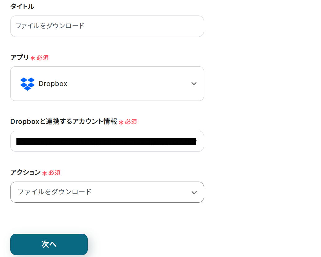 タイトルと連携するアカウント情報を任意で設定し、アクションはテンプレート通りのまま「次へ」をクリックして進んでください。
