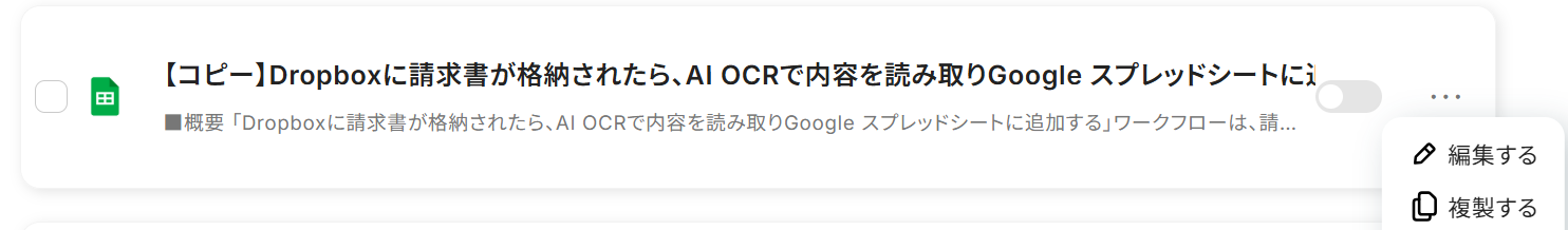 「Dropboxに請求書が格納されたら、AI OCRで内容を読み取りGoogle スプレッドシートに追加する」ワークフローは、請求書データの管理を効率化します。