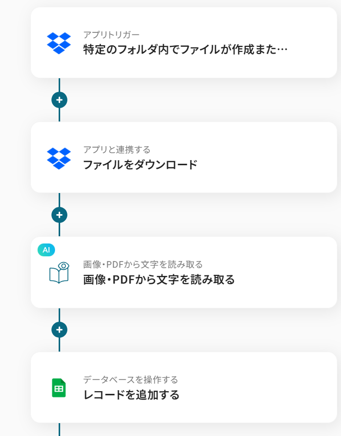 それではここから代表的な例として、Dropboxに新しい請求書ファイルが格納された際に、YoomのAI機能がその内容(請求金額、支払期日、取引先名など)を自動で読み取り、抽出したデータをGoogle スプレッドシートの指定した場所へ自動的に記録するフローを解説していきます!