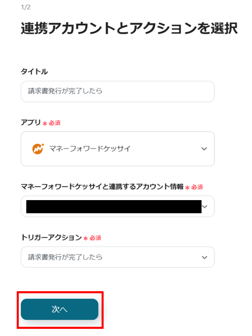 (2)マネーフォワード 掛け払いの連携アカウントとアクションを選択画面からマネーフォワード 掛け払いと連携するアカウント情報に誤りがないかを確認し、トリガーアクションは「請求書発行が完了したら」のままで、「次へ」をクリックします。