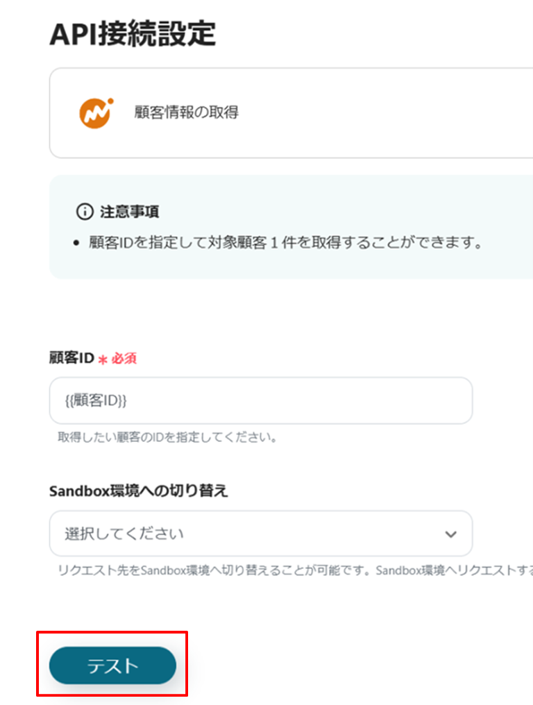 (6)API接続設定画面で、アウトプットから顧客IDを選択します。Sandbox環境に切り替える場合は、プルダウンから「Sandbox環境へ切り替える」を選択してください。