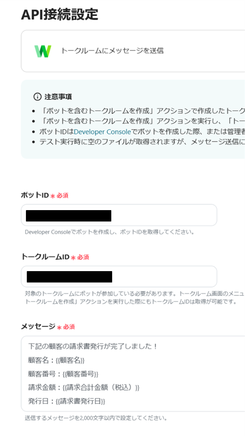 (9)API接続設定画面からボットID、トークルームIDを候補から選択し、LINE WORKSに送られるメッセージを入力します。