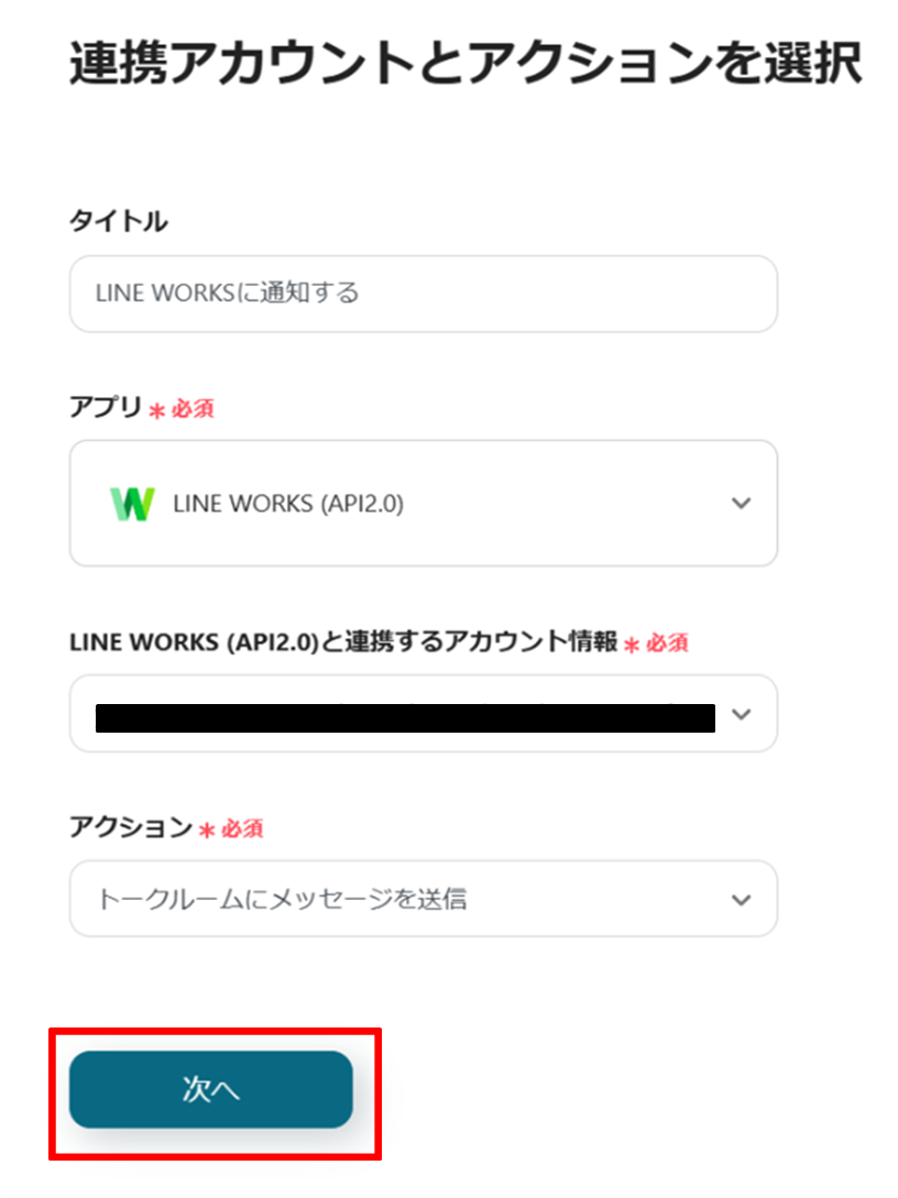 (8)LINE WORKSの連携アカウントとアクションを選択画面からLINE WORKS (API2.0)と連携するアカウント情報に誤りがないかを確認し、アクションは「トークルームにメッセージを送信」のままで「次へ」をクリックします。