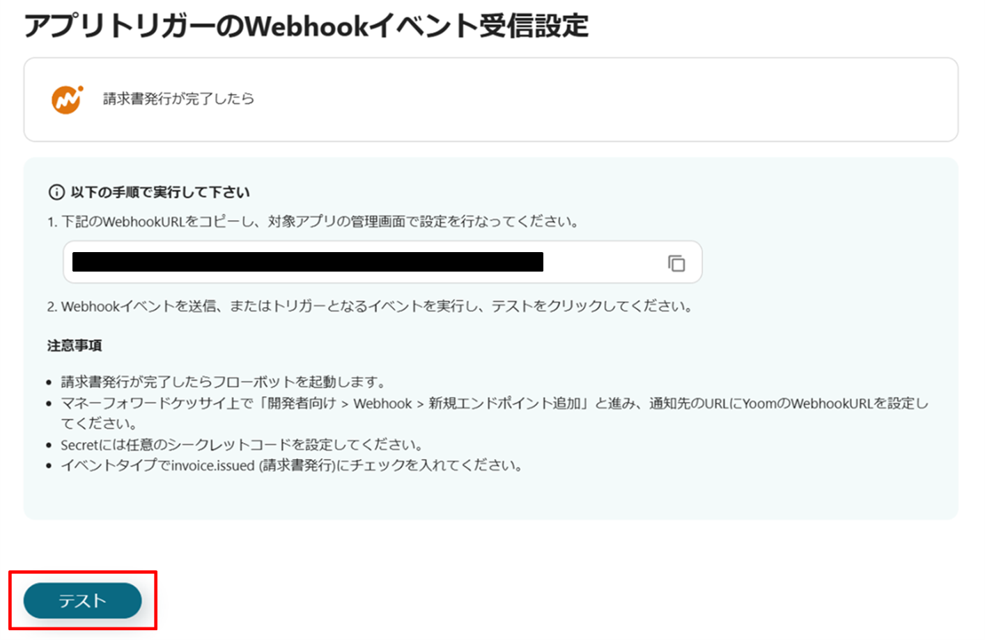 Webhookイベントを送信、またはトリガーとなるイベントの実行が完了したら、「テスト」をクリックし、エラーとならなければ、「保存する」をクリックします。