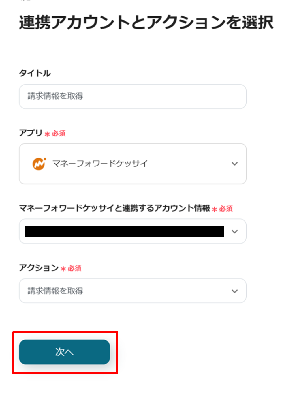 (2)マネーフォワード 掛け払いの連携アカウントとアクションを選択画面からマネーフォワード 掛け払いと連携するアカウント情報に誤りがないかを確認し、アクションは「請求情報を取得」のままで「次へ」をクリックします。