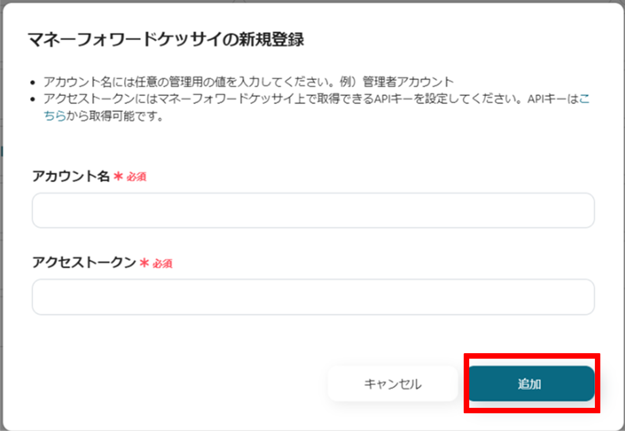 (3)マネーフォワード 掛け払いの新規登録画面より、アカウント名、アクセストークンを入力し、「追加」をクリックします。