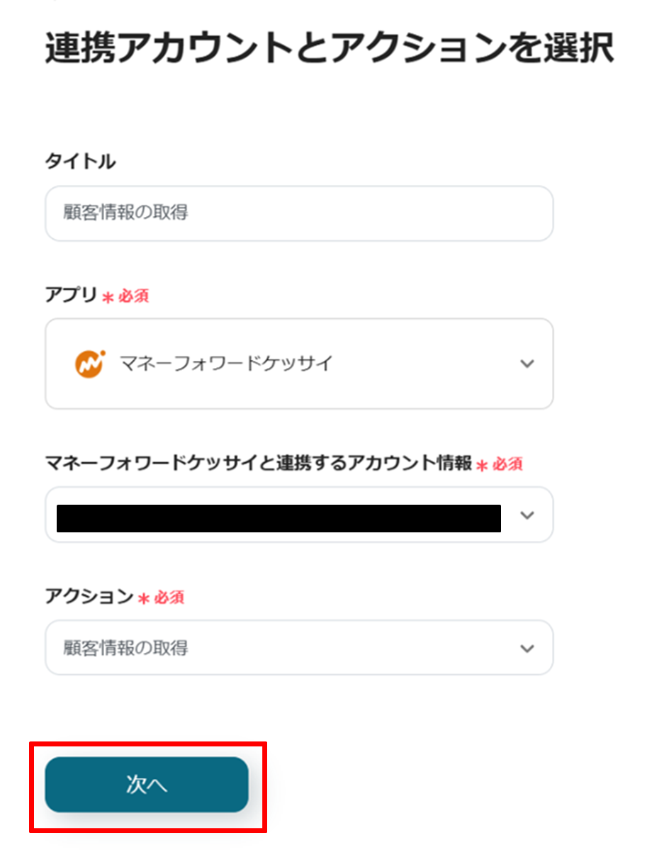 (5)マネーフォワード 掛け払いの連携アカウントとアクションを選択画面からマネーフォワード 掛け払いと連携するアカウント情報に誤りがないかを確認し、アクションは「顧客情報の取得」のままで「次へ」をクリックします。