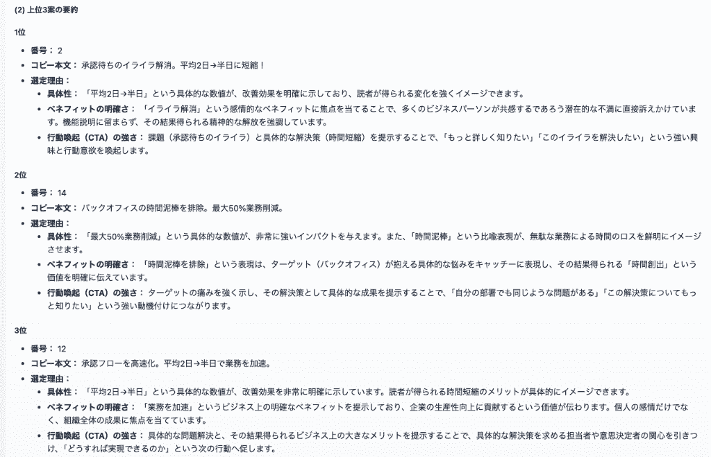 そして、最下部には上位3つのコピー案の選定理由などの要約が記載されていました!