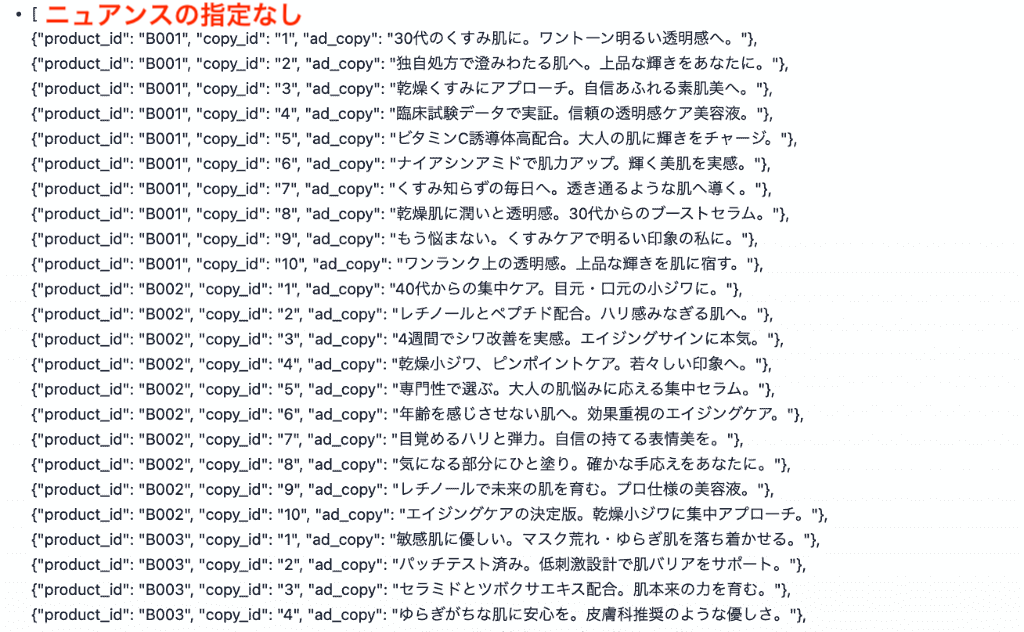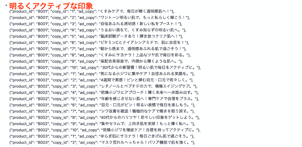 LLMへの指示で1つのIDごとに10個のコピー案を生成するように設定していたため、利点やターゲット層を反映した文章が合計100個生成されました!