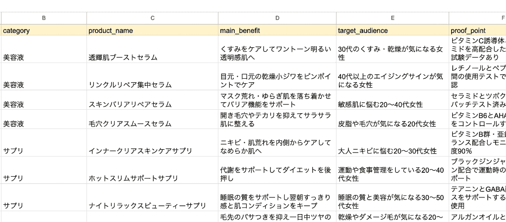 まず、架空の美容商品リスト(美容液、サプリ、ヘアオイルなど10商品×各特徴)をCSVで用意。