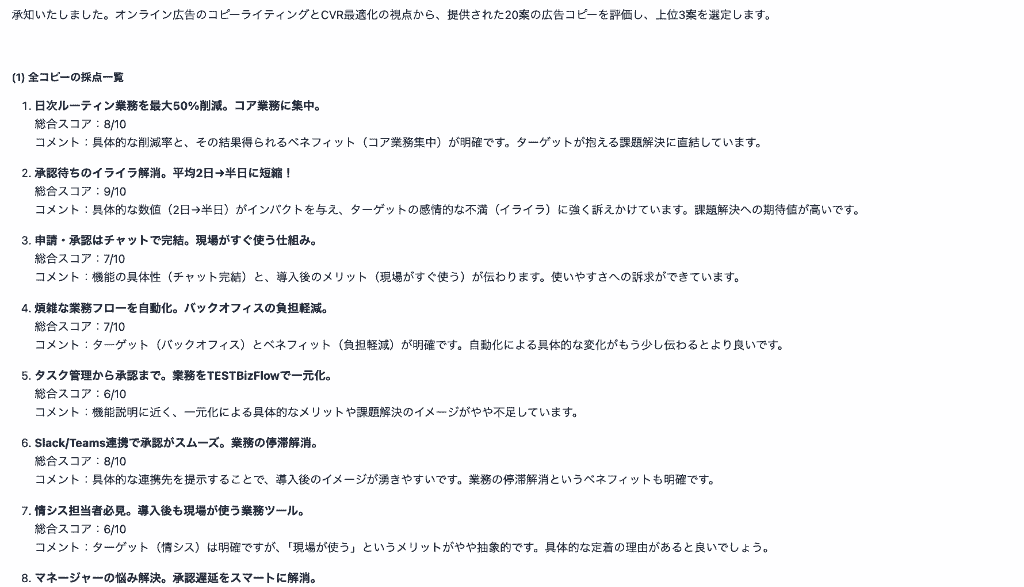例えば、「タスク管理から承認まで。業務をTESTBizFlowで一元化。」という平凡な案は低評価(6点)で弾かれ、「バックオフィスの時間泥棒を排除。最大50%業務削減。」というベネフィット重視の案が高評価(9点)を獲得。