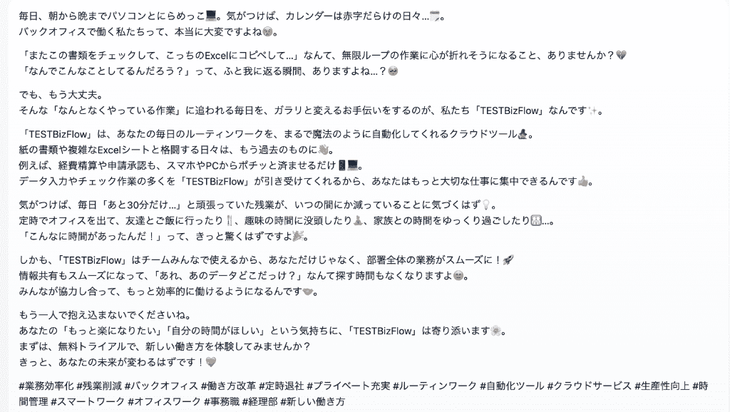 「TESTBizFlow」というクラウド型の業務効率化ツールの投稿用文章を作成してください。 以下の条件を必ず守ってください。