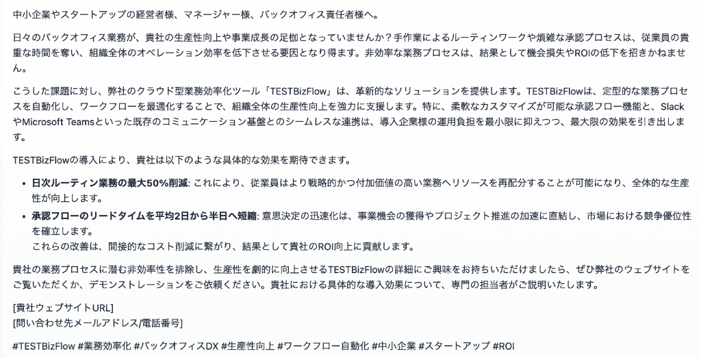 一方、LinkedIn用では「日次ルーティン業務の最大50%削減。全体的な生産性が向上します。」といった堅実なコピーが生成されました。