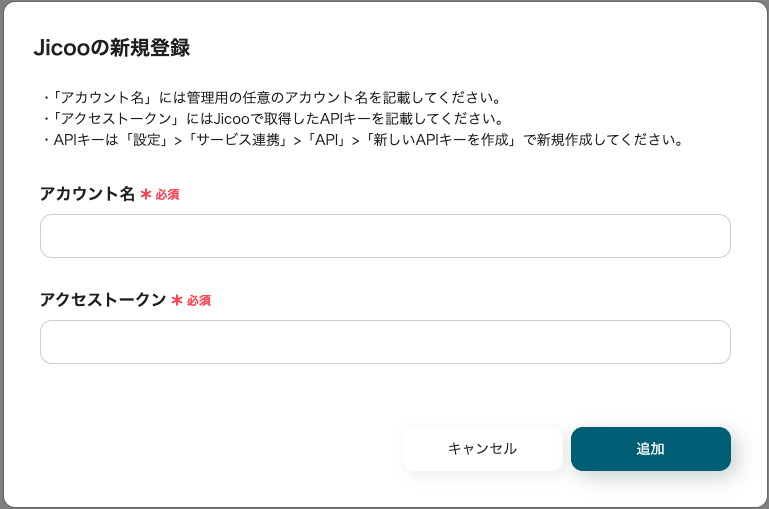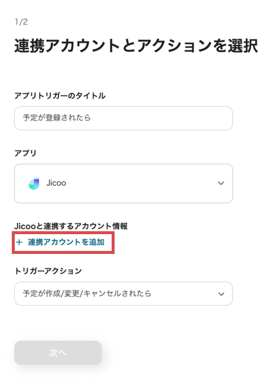 Jicooと連携するアカウント情報は設定を行います。「+連携アカウントを追加」をクリック!