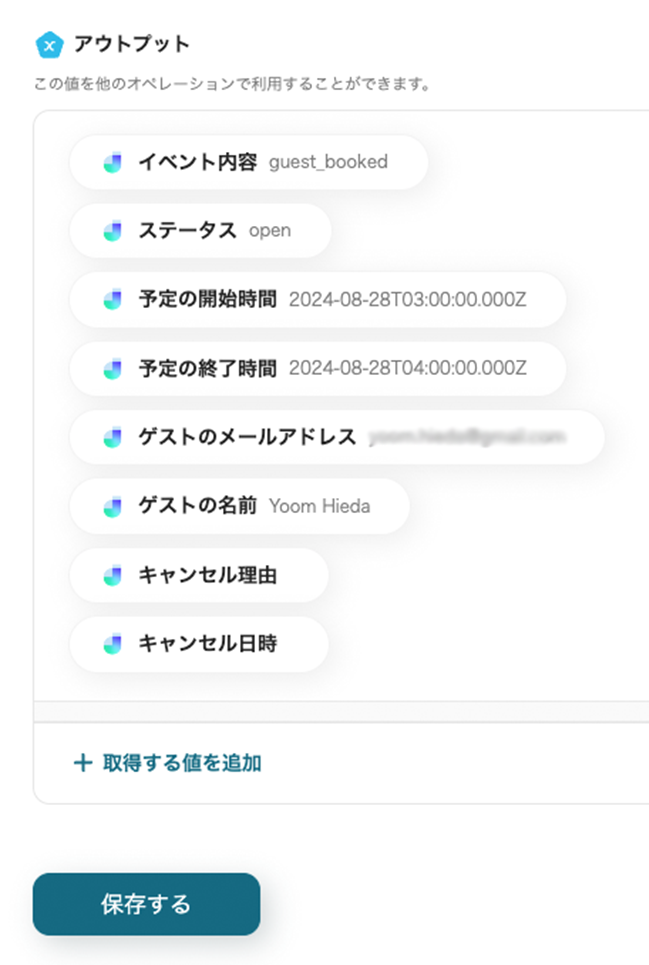 赤枠の編集欄にYoomの画面からコピーしてきたURLをペーストして「保存」します。トリガーになるイベントをJicooで新規登録します。※新しく予約を登録するなど