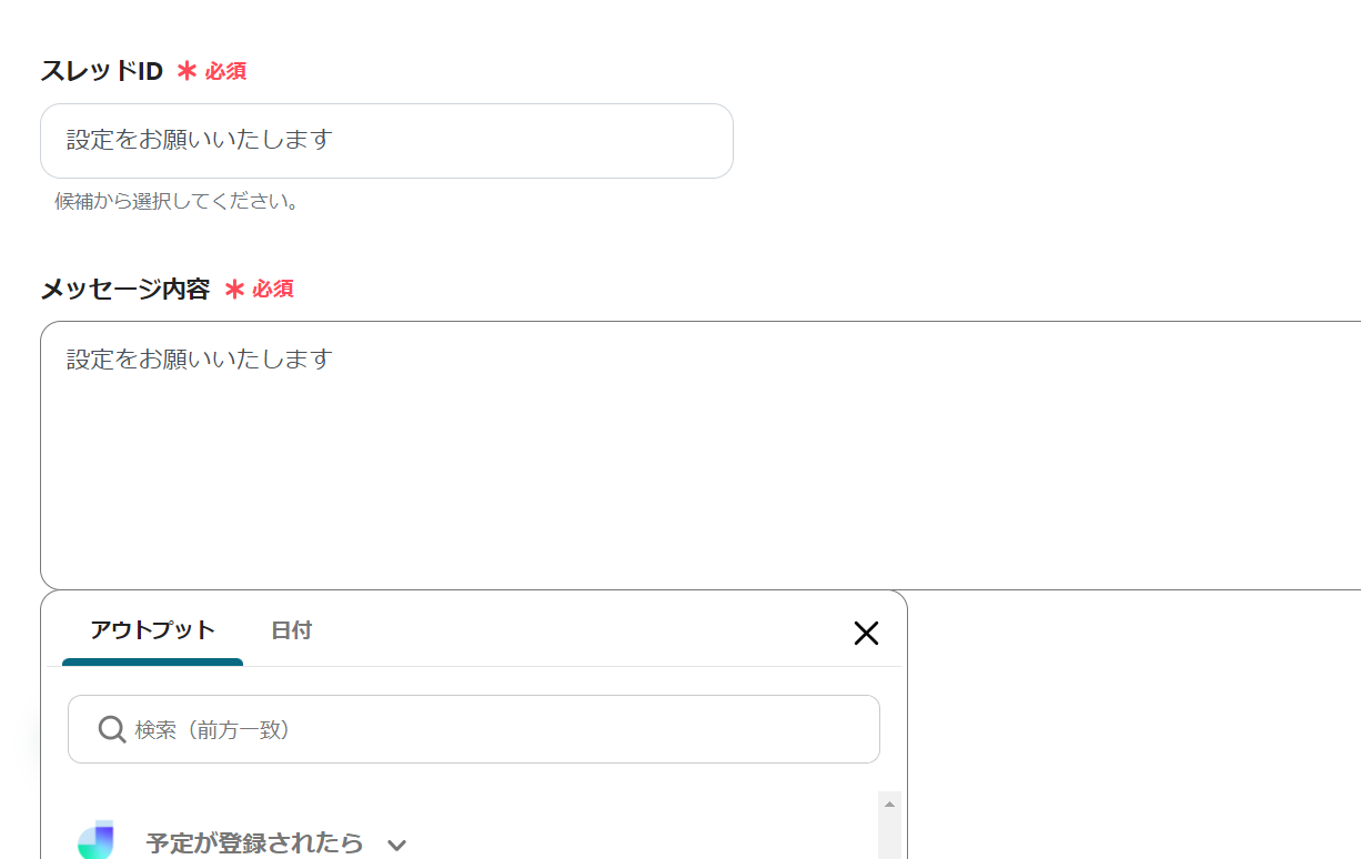 メッセージ内容は先に連携したアウトプット情報を選択することが可能です。