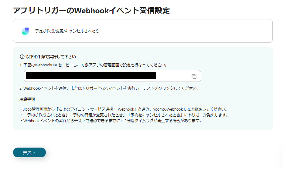 ※Jicoo管理画面から、YoomのWebhookURLをコピーし、対象アプリの管理画面で設定を行います。