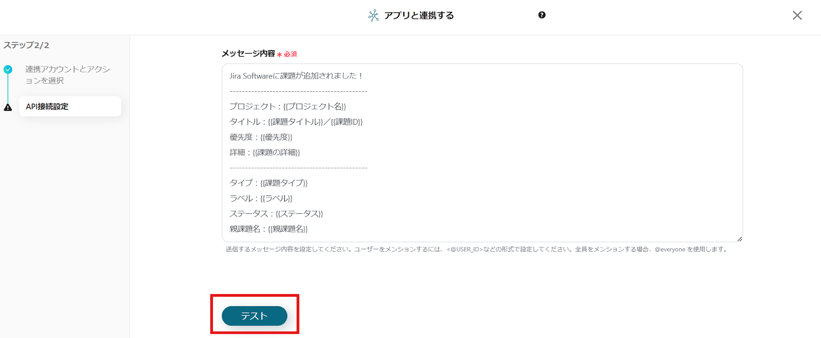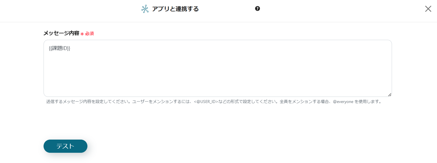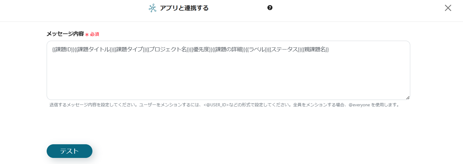 メッセージの設定ができたら、下部にあるテストボタンを押してください。