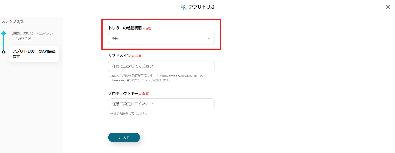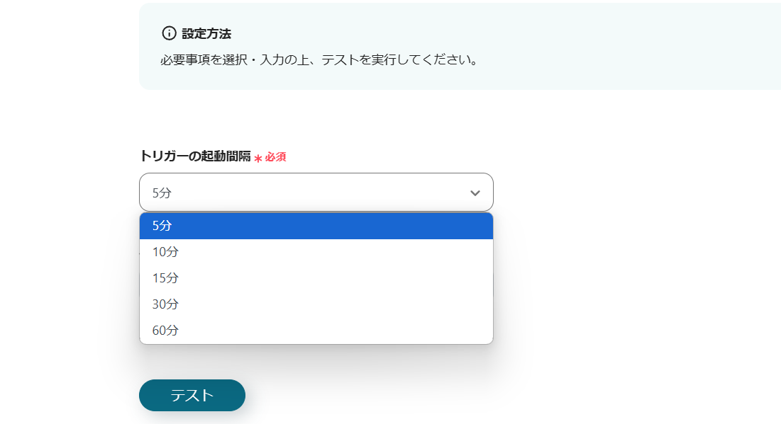 トリガーは5分、10分、15分、30分、60分の間隔で起動間隔を選択できます。