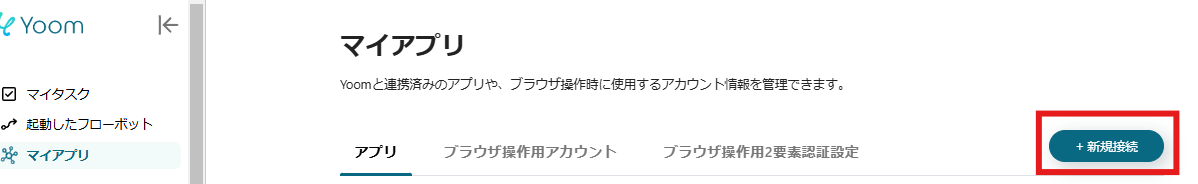 Yoomのマイアプリをクリックし、画面右側の新規接続をクリックします。