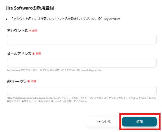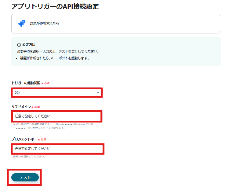 ・サブドメイン:JiraのURL内から取得が可能です。「https://●●●●●●.atlassian.net/」の「●●●●●●」部分がサブドメインとなります。