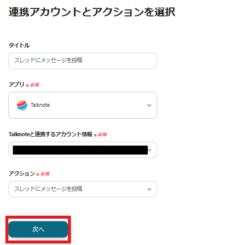 「連携アカウントとアクションを選択」の画面が表示されるので、今回連携するTalknoteのアカウントに間違いないか確認し「次へ」をクリックします。