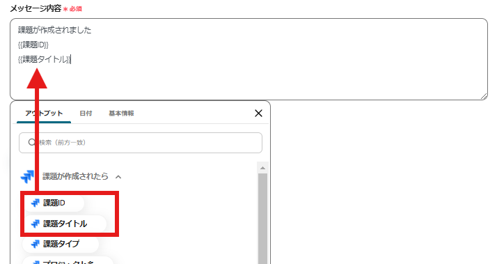・メッセージ内容:クリックするとアウトプットが表示されます。以下の画面を参考に入力します。