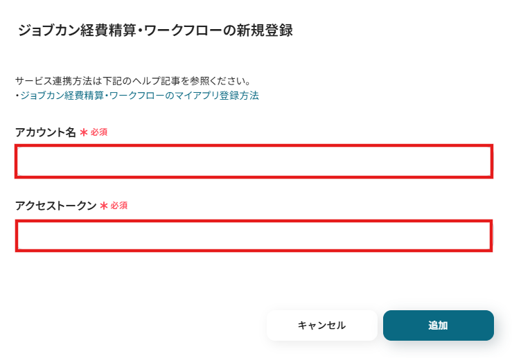 ジョブカン経費精算・ワークフローを選択できたら、使用するアカウントと事前に取得したアクセストークンを入力して「追加」してください。