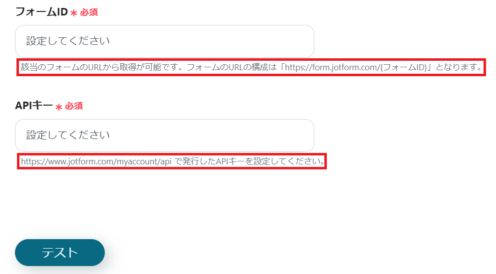 フォームIDとAPIキーを入力しましょう。赤枠の内容に沿ってコピー&ペーストをすれば大丈夫です。