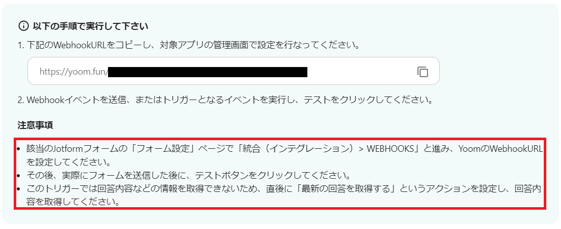 この設定に関してもJotformのWebhookの設定と最新回答の取得方法についてのページで説明がされているので、確認しながら進めましょう。