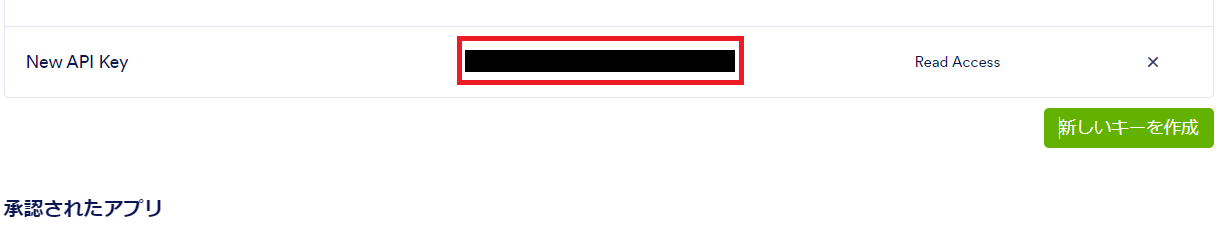 そうすると、赤枠の部分にAPIキーが作成されます。