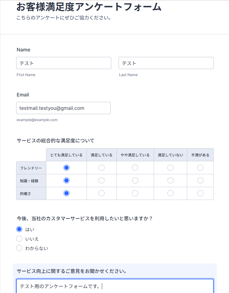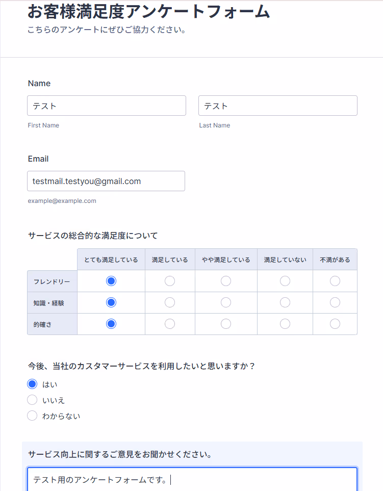この後の設定やテストで使用するフォームをJotformで作成し、回答の送信まで済ませておきましょう。