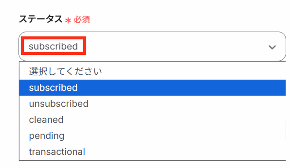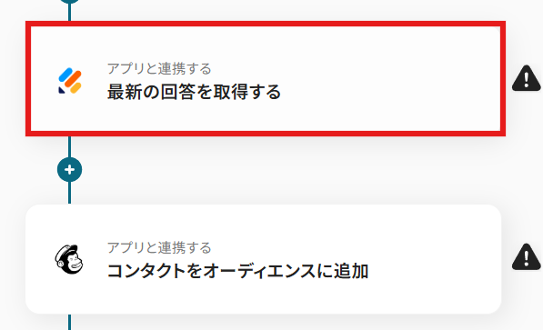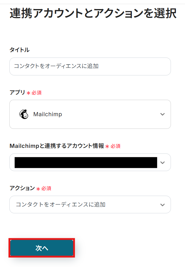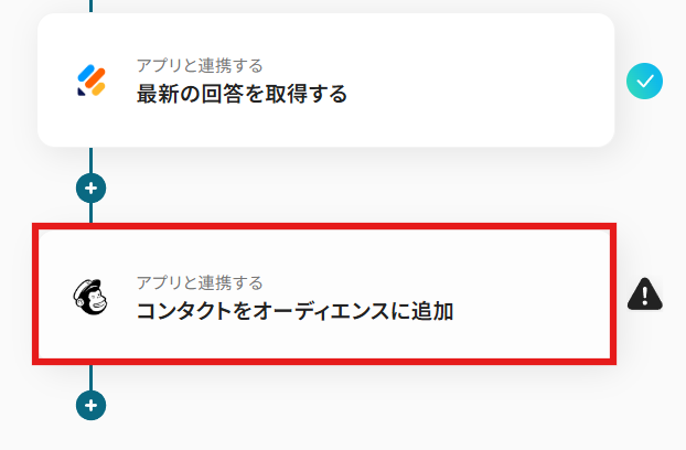 次に、フォームの回答から取得した内容を、Mailchimpのコンタクトに追加するアクションの設定を進めていきます。
