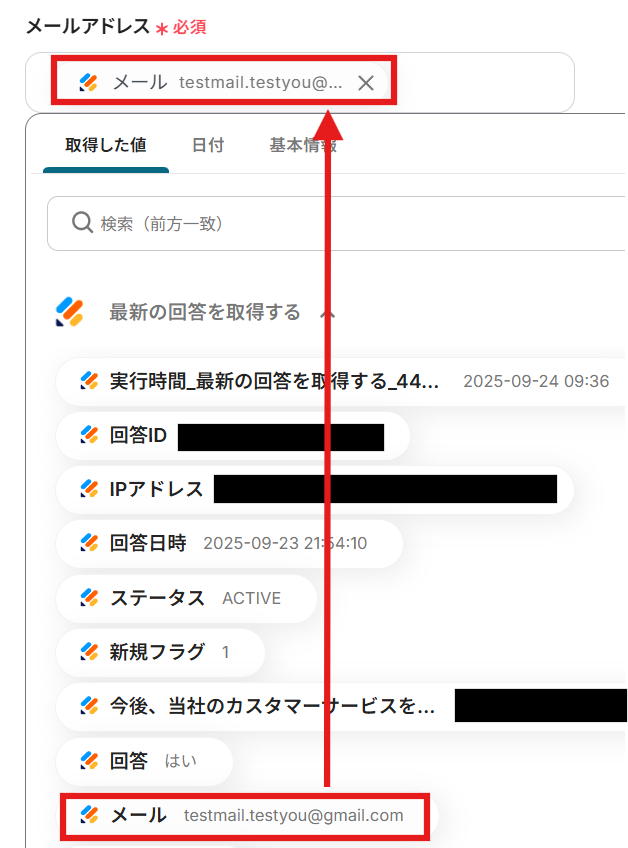 テストが成功したら、「取得した値」が表示されます。ここで取得した値をMailchimpに自動登録可能です。