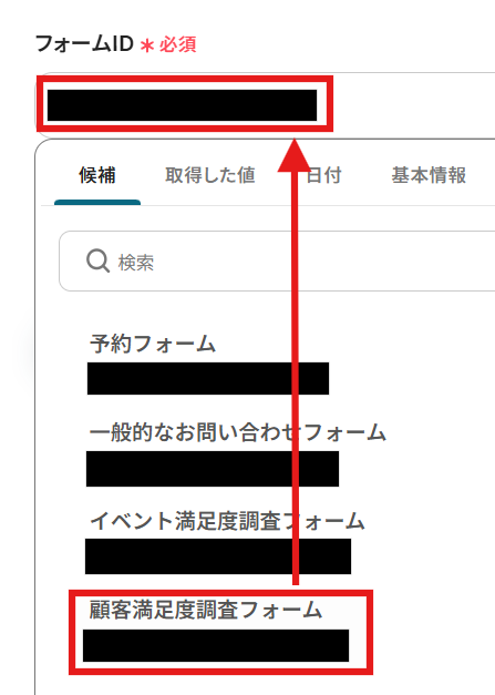 フォームIDは入力欄をクリックすると選択肢が表示されますので、候補の中から先ほどテスト用に作成・回答送信をおこなったフォームを選びましょう。