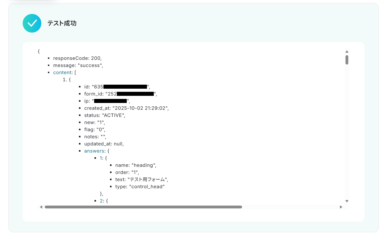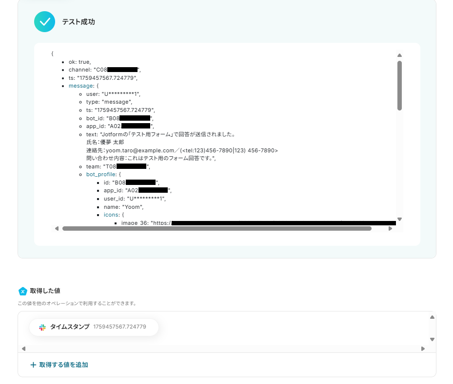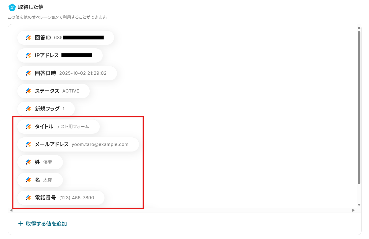 - テストに成功すると、「取得した値」に回答IDや回答日時などが追加されます。