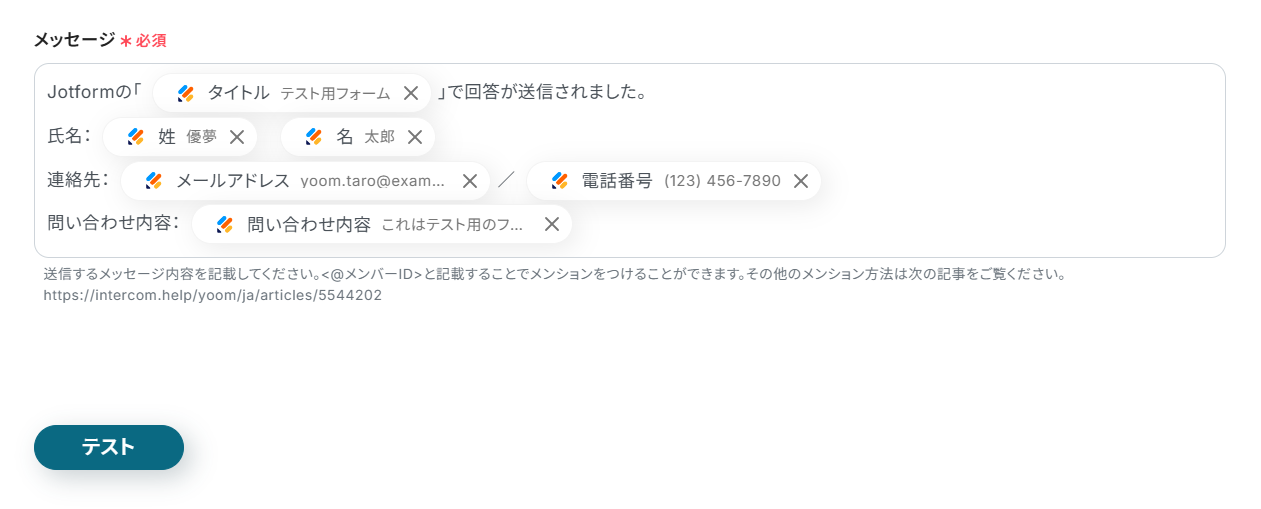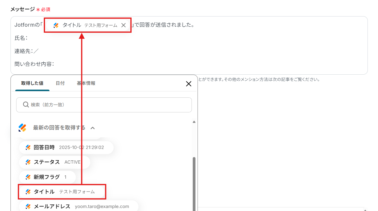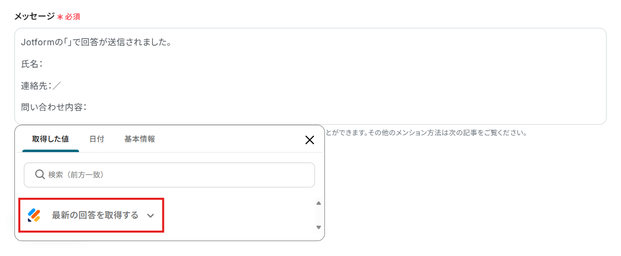 なお、取得した値を活用せずテキストを直接入力した箇所は固定値のため定型文となります。そのため、定型文にしたい箇所はテキストを直接入力し、毎回変動することが望ましい回答データは取得した値を活用しましょう。
