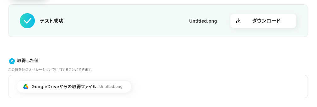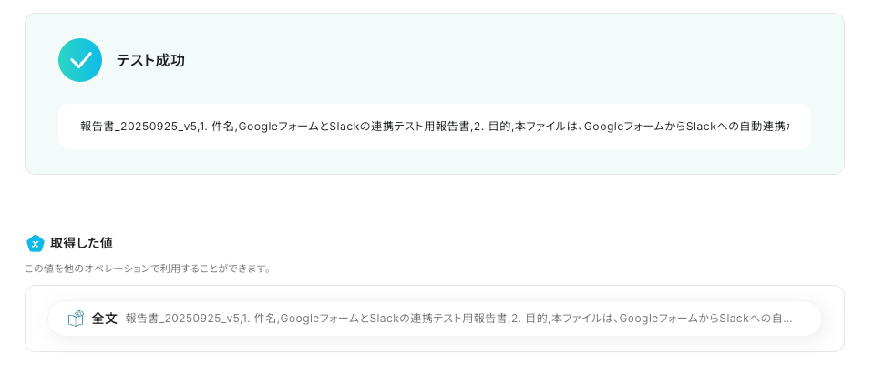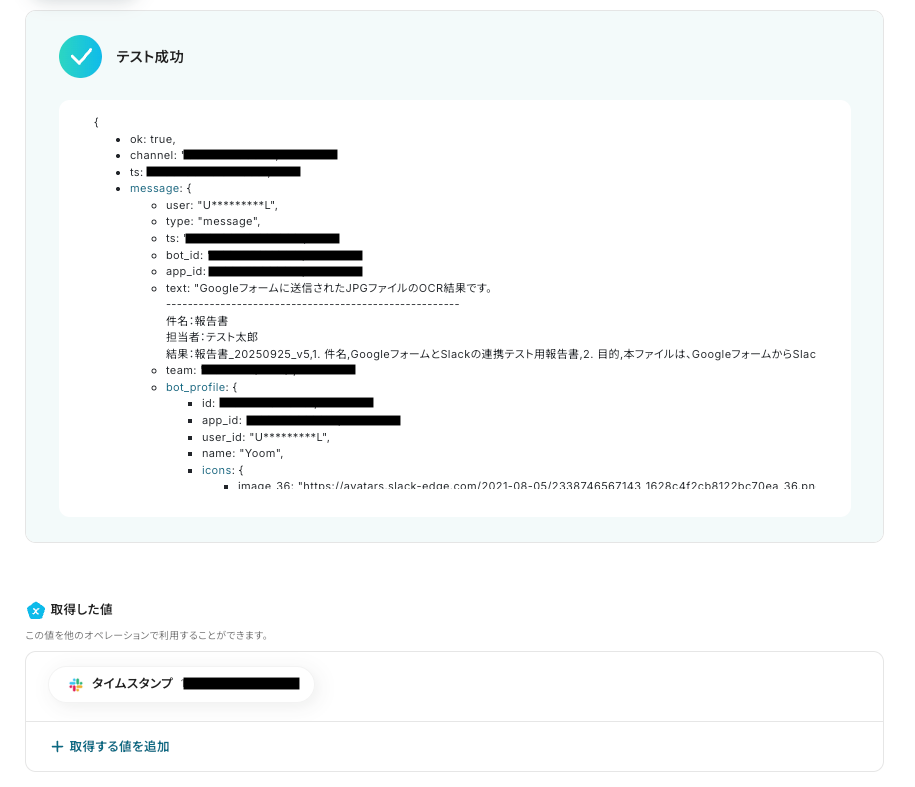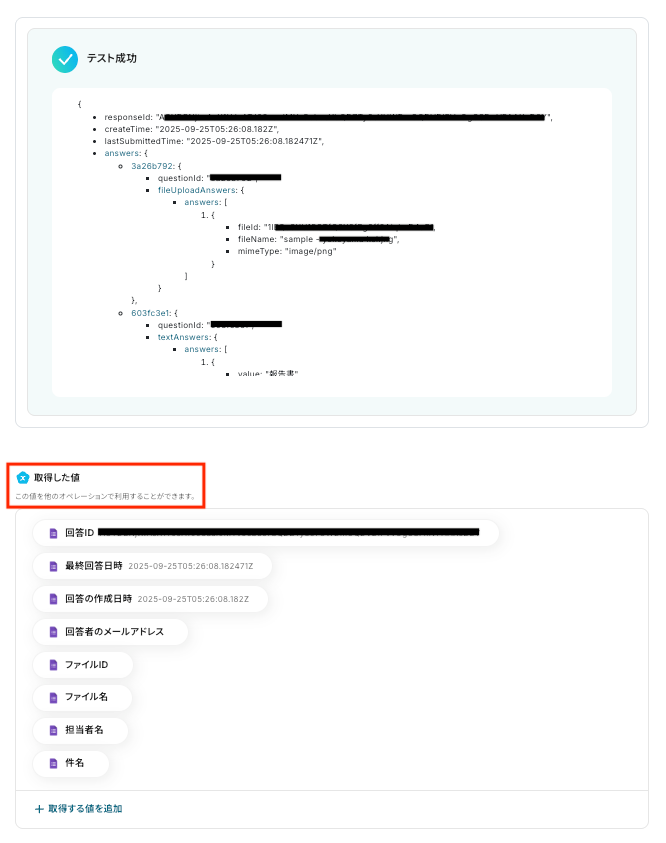 フォームから回答が送信できたらテストボタンをクリックしましょう。テストが成功すると、以下のように「取得した値」が表示されます
