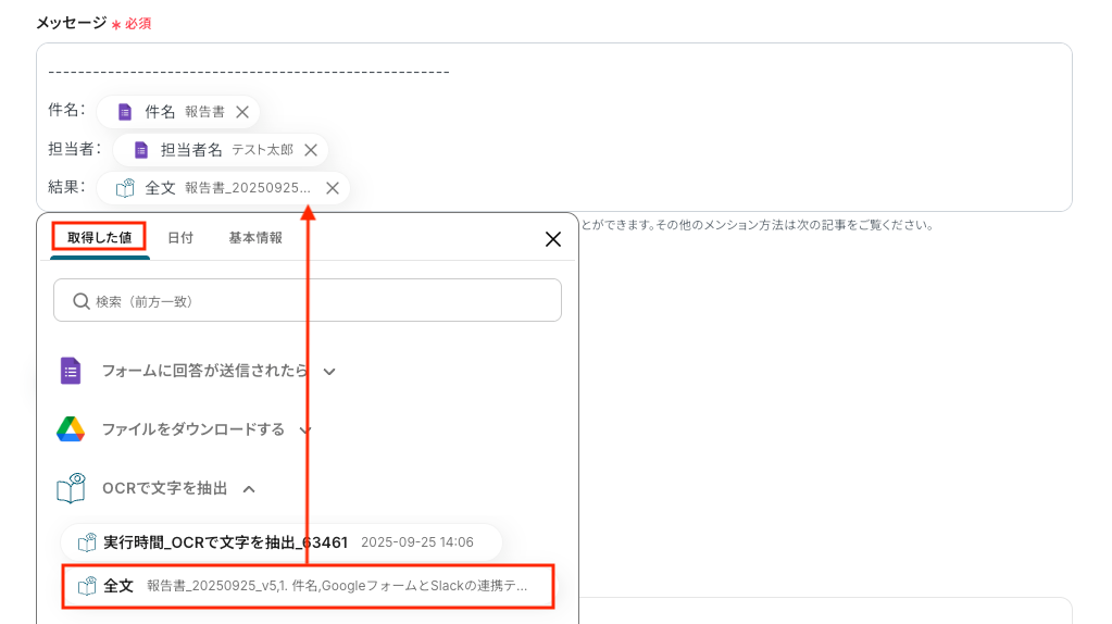 「メッセージ」は取得した値から選択し、必要に応じて任意のテキストを手動で入力してください。なお、取得した値を活用せずテキストを直接入力した箇所は固定値のため定型文となります。