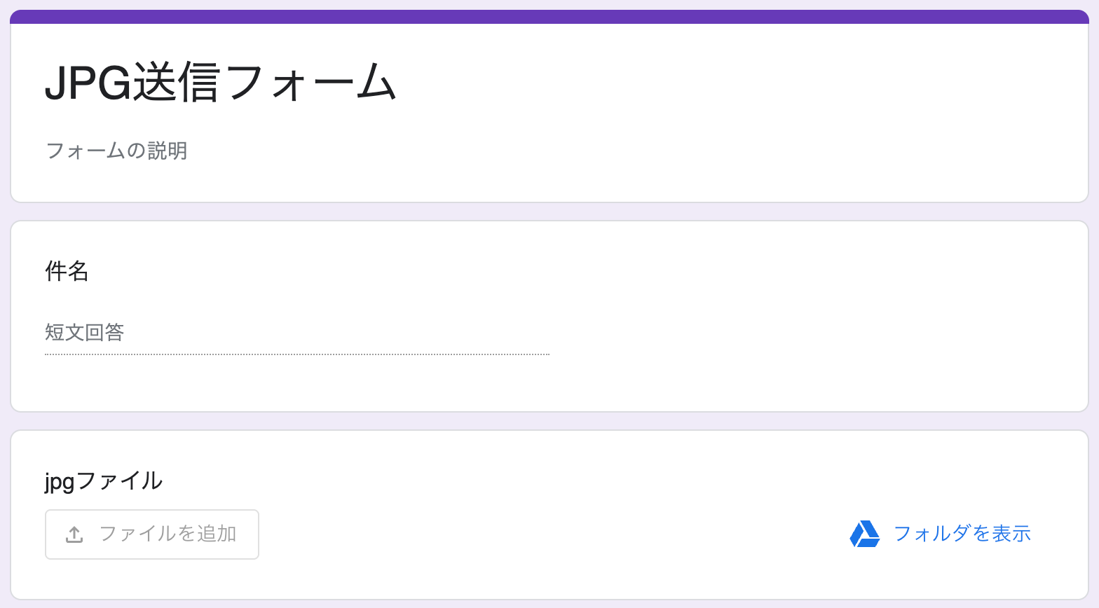 テストを行う際は、トリガーとなるフォームの回答(=JPGファイルの送付)が必要です。あらかじめGoogleフォームを作成し、回答を送信しておきましょう。