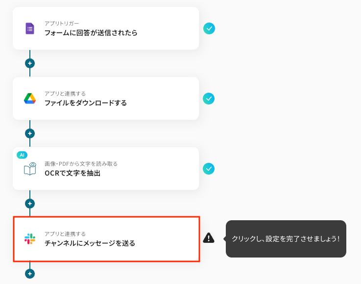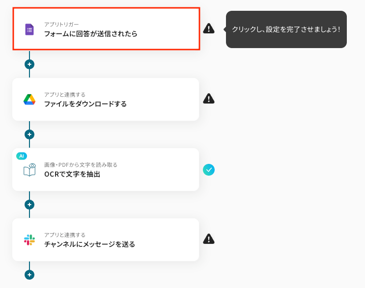 それではここから代表的な例として、Googleフォームで送信されたJPGファイルをOCRでテキスト化し、結果をSlackに通知するフローを解説していきます!