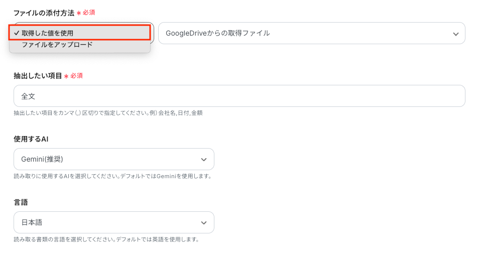 A:はい、可能です。「OCRで文字を抽出」の設定で、例えば名刺に記載のある「会社名」やレシートの「合計金額」などを、「抽出したい項目」に指定いただくと、画像から特定の項目だけを抜き出せます。