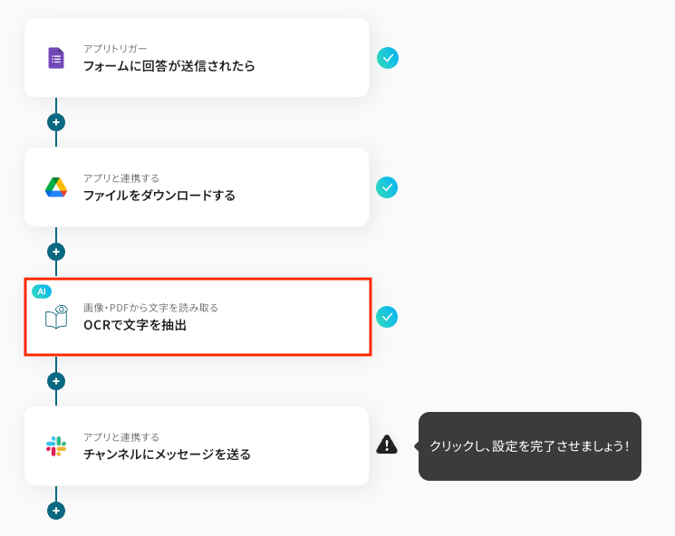このワークフローを活用すれば、GoogleフォームにJPGファイルが送信されるだけで、画像内のテキストを自動的に抽出し、Slackへ通知する一連の流れを自動化し、これらの課題を解消します。