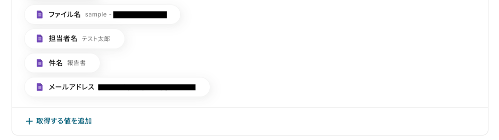回答内容の取得する値が追加できると空欄が埋まり、以下のように表示されます。