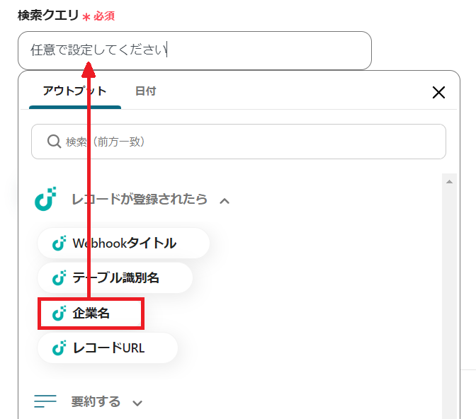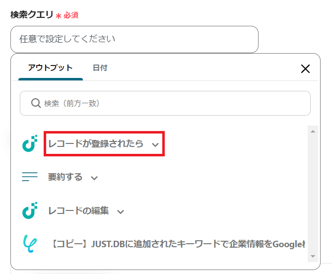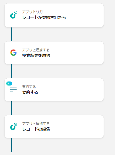 今回は「企業情報の収集」を想定した自動化です。JUST.DBに追加された「企業名」をもとに検索を行い、自動要約後、「要約結果」が更新されるようになります。