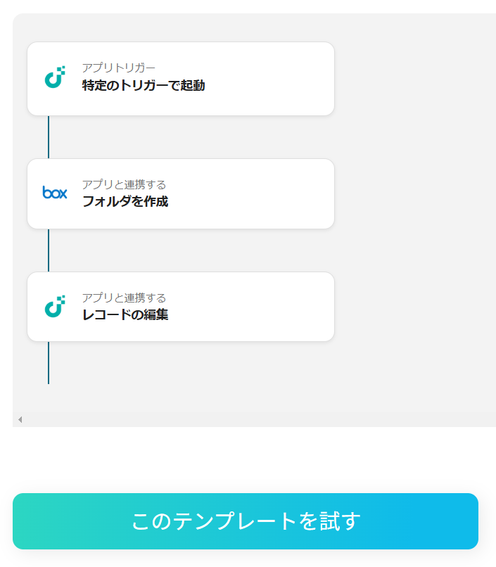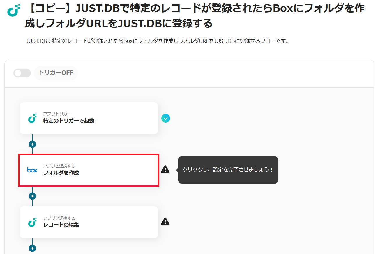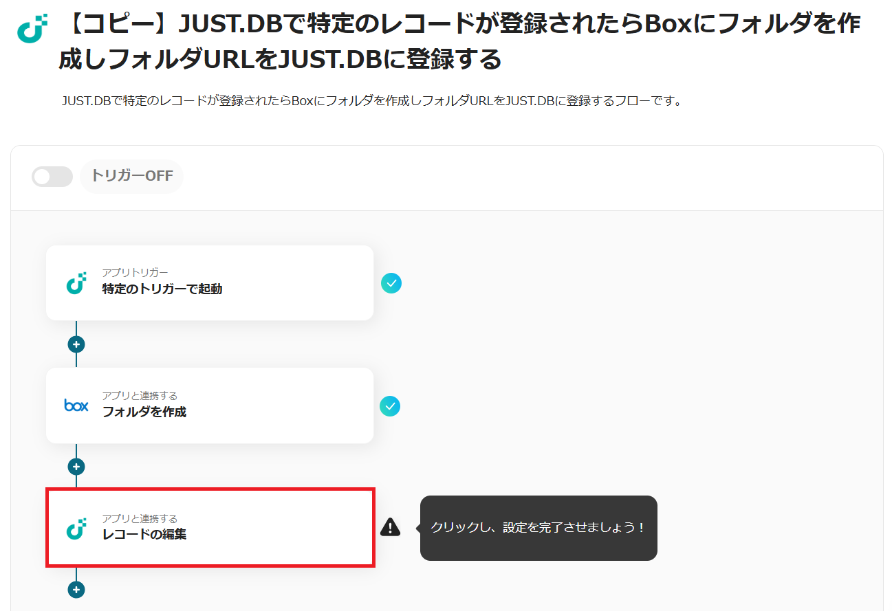 以降は、JUST.DBで特定のレコードが登録されたら、Boxにフォルダが作成され、フォルダURLがJUST.DBに登録されるプロセスが自動化されます。