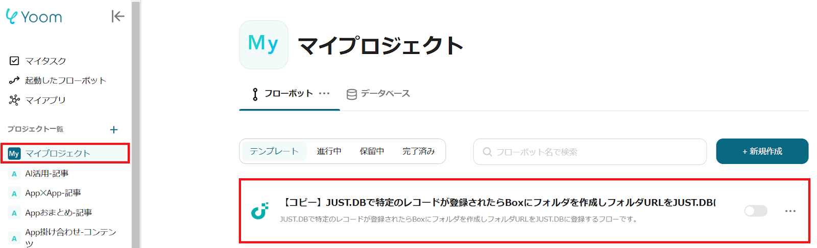 1.「マイプロジェクト」から「【コピー】JUST.DBで特定のレコードが登録されたらBoxにフォルダを作成しフォルダURLをJUST.DBに登録する」というフローボットをクリックします。
