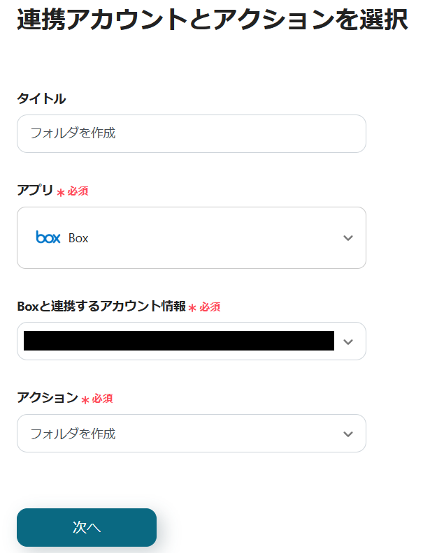 2.Boxと連携するアカウント情報を選択し、アクションが「フォルダを作成」になっていることを確認したら「次へ」をクリックします。
