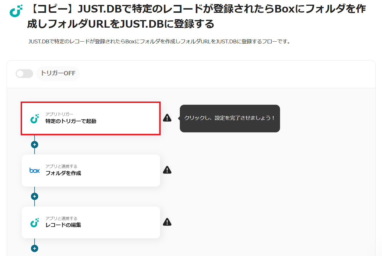 続いて、JUST.DBとBoxを連携するときに、自動化の起点となるトリガーアクションを設定します。