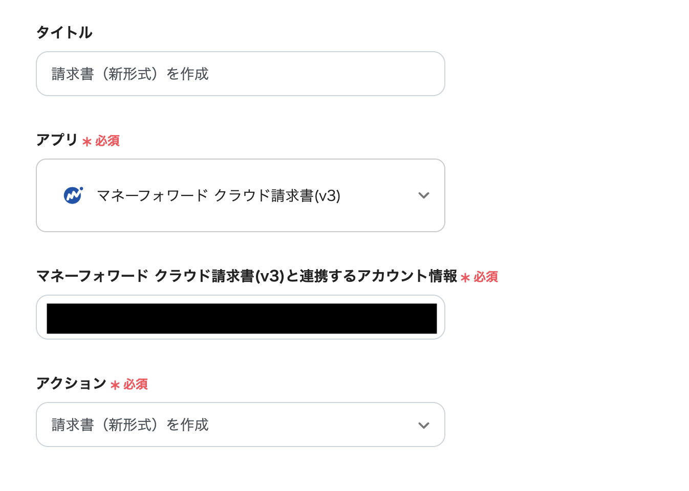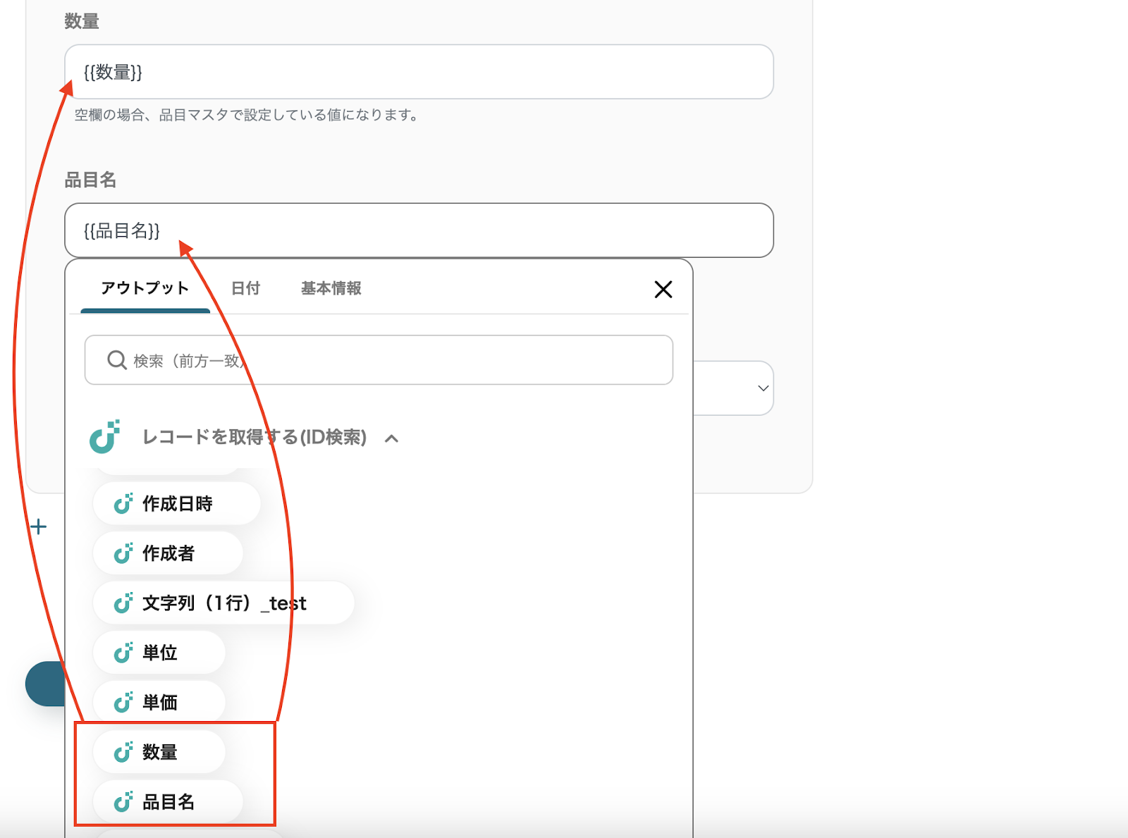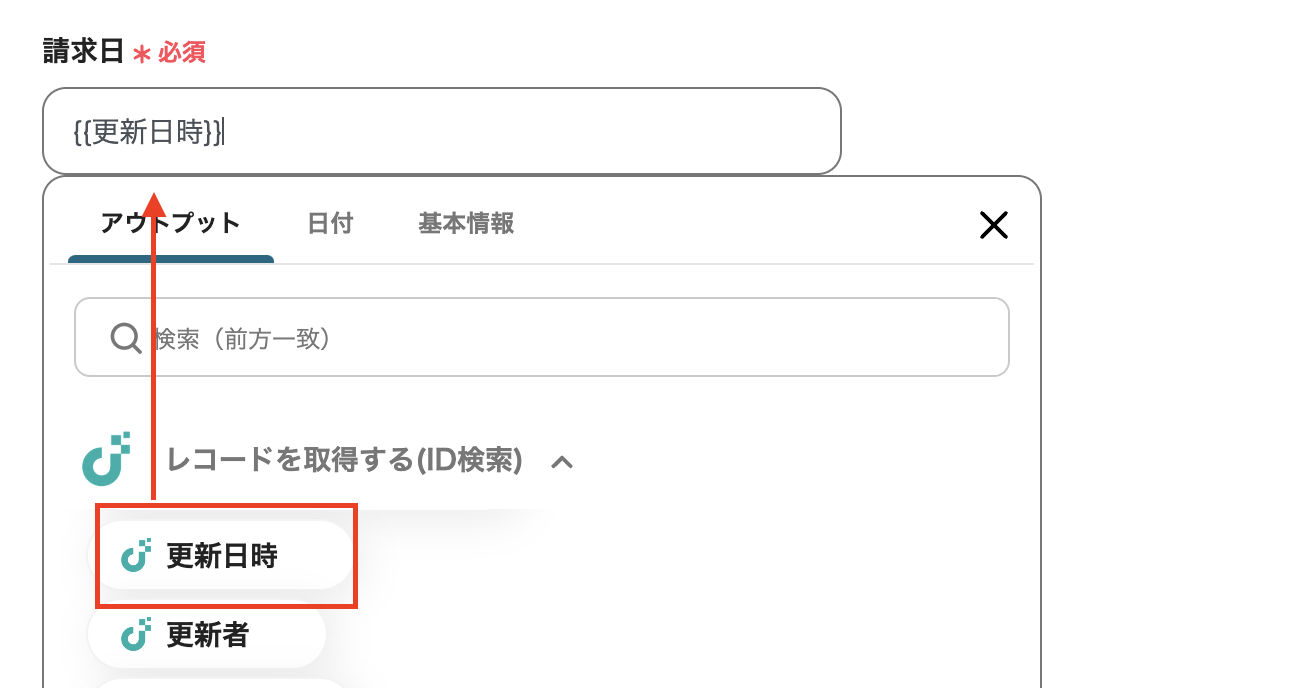 (以下の画像は例として、「請求日」の項目に前ステップで取得したアウトプット【更新日時】を設定したものです。)